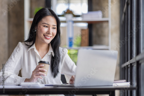 Portrait of Attractive Asian woman working with laptop computer in the office hand holding cup of coffee.