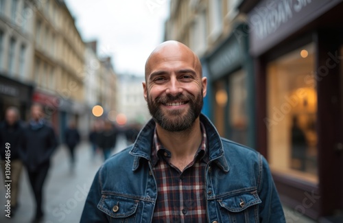 Portrait of bald, bearded man smiles in London street. Confident, happy, mature businessman in casual attire. He wears denim jacket, checkered shirt. Urban background with blurred pedestrians.