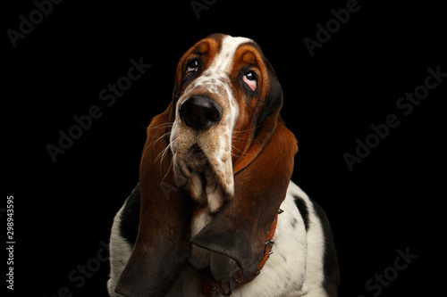 Portrait of Basset Hound Dog with Indifferent Looking up on Isolated black background, front view