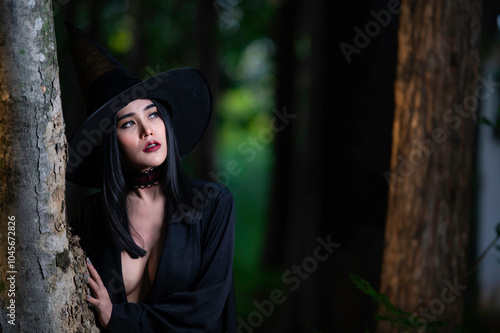 Portrait of beautiful asian sexy woman wear black witch costume with broom,Halloween festival concept