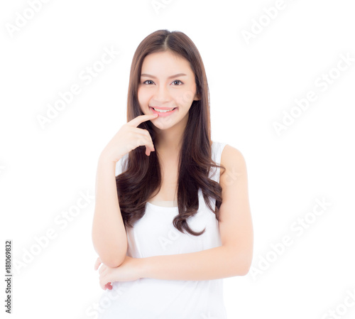 Portrait of beautiful asian woman makeup of cosmetic, girl hand touch mouth and smile attractive, lips beauty perfect with wellness isolated on white background with healthcare concept.