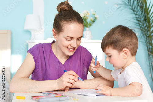 Portrait of beautiful female with hair knot, dressed in casual purple t shirt, draws together with her little son, tries to develop his mind and prepare for school. Children and creativity concept