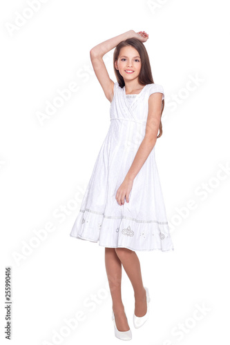 active, background, beautiful, beauty, casual attire, caucasian, children, childhood, clothes, dress, feeling, full-length, fun, fur, girl, happy, isolated, joy, children, kindness, leisure, life, lifestyle, little, people, pleasure, pose, posing, relaxation, smile, white, young