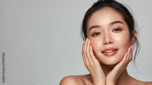 Portrait of beautiful happy Asian woman model touching healthy facial skin on clean background, cosmetics concept with copy space