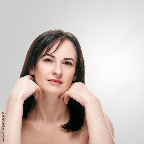 aged, attractive, background, beautiful, beauty, brunette, care, clean, clear, complexion, cosmetic, cosmetology, face, female, fresh, hair, hand, happy, head, health care, healthy, hydratation, isolated, lifestyle, lifting, make-up, mature, middle, model, natural, perfection, person, plastic, portrait, pure, rejuvenation, salon, shot, skin, skincare, smile, spa, studio, touching, treatment, vitality, wellness, white, woman, young