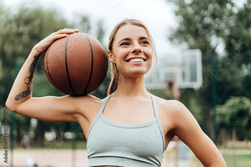 Portrait of beautiful, happy woman, sportswoman holding basketball, looking away, training outdoors