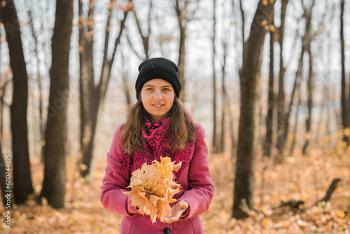 Portrait of beautiful happy young woman in pink jacket holding bouquet of yellow leaves at autumn park. Pretty Caucasian lady smiling and looking at camera during her walk outdoors. Generation Z and