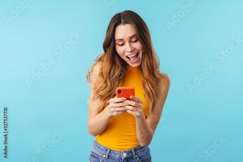 portrait, woman, isolated, standing, smiling, positive, caucasian, girl, gorgeous, brunette, friendly, joyous, attractive, charming, cute, female, cheerful, beautiful, nice, joyful, optimistic, blue, background, emotion, 1, studio, model, young, person, appearance, facial, expression, closeup, indoor, excited, happy, delighted, mobile phone, smartphone, mobile