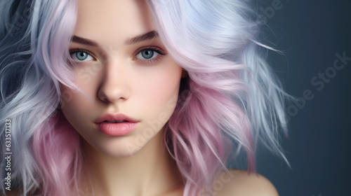 Portrait of beautiful model with blue pink hair for an advertisement for cosmetics brand.
