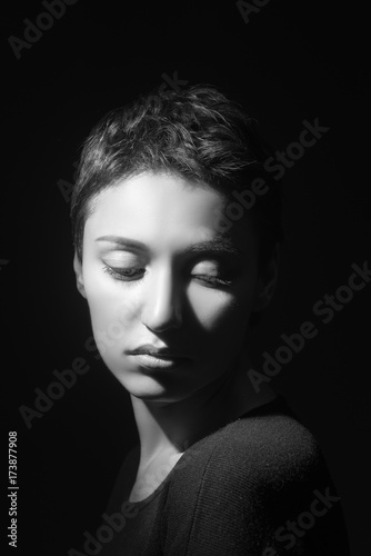 attractive, background, beautiful, beauty, black-and-white, caucasian, confident, dark, face, fashion, fashionable, female, gorgeous, coiffure, head, light, lip, looking, luxurious, make-up, model, monochrome, one person, people, person, portrait, pretty, seduce, sensual, shade, skin, style, stylish, woman, young, youth