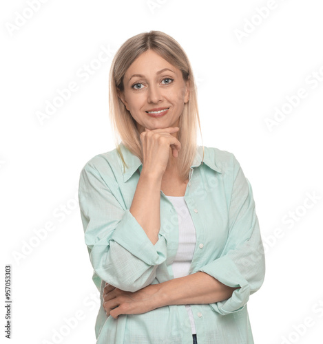adult, age, appearance, attractive, background, beautiful, casual attire, caucasian, cheerful, clothes, confident, face, fashion, female, hair, happy, healthy, isolated, lady, leisure, lifestyle, middle, model, natural, 1, person, portrait, positive, shirt, simple, smile, smiling, studio, style, stylish, success, trend, trendy, white, woman
