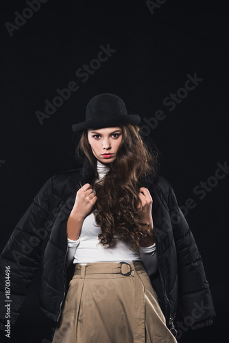 portrait of beautiful woman in hat and winter jacket looking at camera isolated on black
