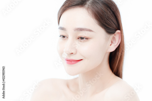 beauty, make up, skincare, woman, female, portrait, lady, facial, contemplation, foundation, portrait, person, young, one person, asian, facial expression, face, make-up, make-up, cosmetic, pretty, beautiful, beautiful woman, sexy, white background, upper body, copy space, bare skin, skin, damp, gain, moisture, moisturise, profit, richness, wetness, transparency, aesthetic, smile, stylish, indoor