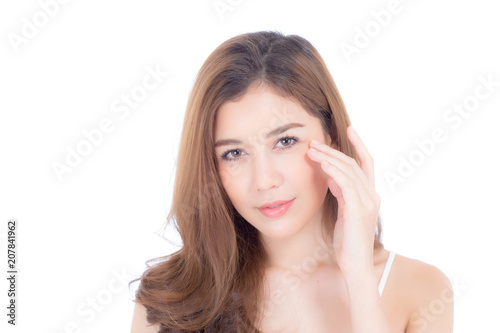 Portrait of beautiful woman makeup of cosmetic, girl hand touch cheek and smile attractive, face of beauty perfect with wellness isolated on white background with skin healthcare concept.