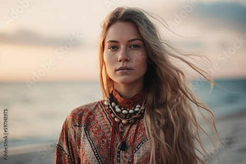Portrait of beautiful woman standing on the beach, wearing stylish boho dress and jewlery, Generative ai
