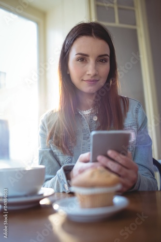 hot drink, woman, happiness, wireless, drink, food, nonalcoholic, beautiful, cafeteria, casual attire, mobile, sweet, white, sharpened, camera, young, communication, refreshment, attractive, smartphone, technology, connection, eatery, mobile phone, freshness, lifestyle, industry, beverage, client, clothing, portrait, caffeine, smiling, holding, looking, sitting, fashion, cupcake, leisure, retail, window, table, house, phone, with, cafes, shop, shot, and, cup