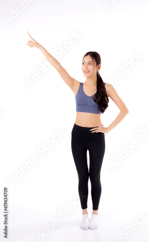 Portrait of beautiful young asian woman in sportwear smile and presenting isolated on white background, sport and exercise for health and weightloss, female and slimming showing something.