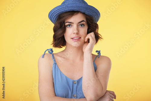 adorable, attractive, background, beautiful, beauty, casual attire, caucasian, charming, chestnut, clothes, colours, cute, elegant, fashion, female, girl, hair, hat, lady, lifestyle, make-up, model, people, person, portrait, pretty, romantic, style, top, trend, vogue, wavy, woman, yellow, young