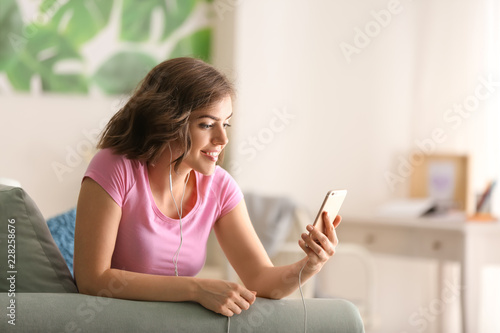 Portrait of beautiful young woman with mobile phone listening to music at home