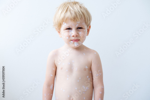 portrait of blonde little boy with red rashes Chicken pox virus, varicella with medical cream