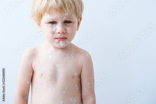portrait of blonde little boy with red rashes Chicken pox virus, varicella with medical cream