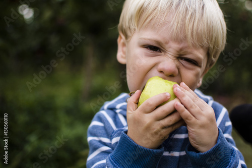 boy, preschool, caucasian, children, apple, green, eat, bite, face, outdoors, day, food, people, lifestyle