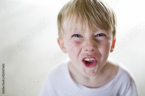 one person, boy, childhood, blonde hair, portrait, top, white background, closeup, male, children, attitude, brash, real people