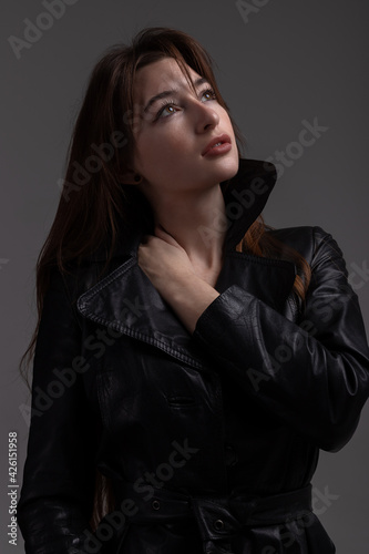 young, model, total, black, posing, standing, trench, pose, grey, studio, light, woman, background, half, length, art, girl, fashion, dark, colours, long, hair, adult, attractive, creative, glamour, indoor, 1, style, trendy, concept, elegant, sexual, looking, camera, european, slim, feminine, modelling, romantic, jacket, clothing, natural, leather, lip, make-up, naked