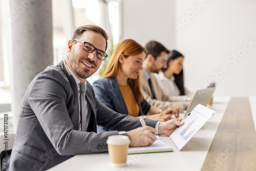 Portrait of businessman sitting at corporate office and analyzing data with his team in a blurry background.