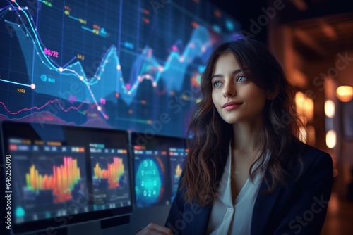 Portrait of businesswoman looking at camera while standing in front of computer monitor with stock market chart.Generative Ai