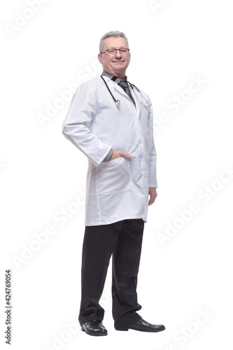 Portrait of caucasian male doctor wear white medical uniform, stethoscope and glasses look at camera