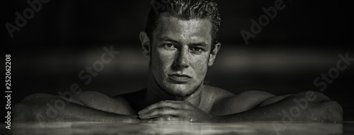 young, portrait, black, body, model, muscular, photogenic, fitness, people, guy, dark, person, face, fashion, muscle, strong, white, sport, torso, beautiful, man, swimming pool, pool