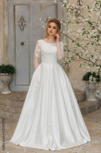 Portrait of charming woman in wedding dress. Posing on the background walls with classic moldings