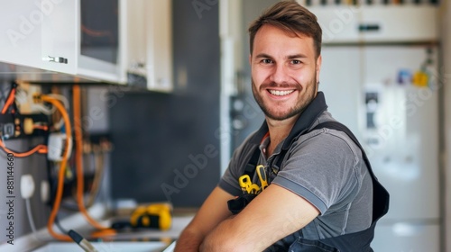 portrait of cheerful Caucasian electrician engineer or electrical equipment installer in uniform repairing or installing equipment in the customer's home