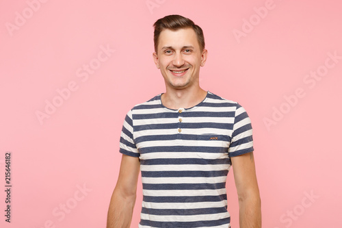 Portrait of cheerful smiling young hipster man dresssed casually in striped t-shirt isolated on trending pink background. People sincere emotions, youth lifestyle concept. Advertising area copy space.