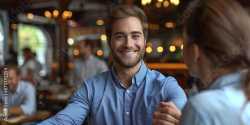 Portrait of cheerful young manager handshake with new employee.