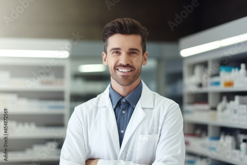 apothecary, pharmacy, portrait, store, doctor, medicine, man, male, chemist, labcoat, checkout, confidence, standing, selling, arms crossed, service, merchandise, occupation, business, indoor, industry, working, people, shelf, adult, assistance, professional occupation, horizontal, part of, well-being, adults only, copy space, lifestyle, looking, photo, retail, variety