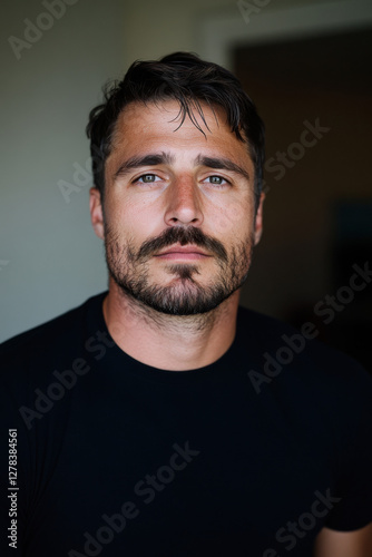 man, portrait, beard, moustache, confident, serious, style, black, t, shirt, close, up, head shot, male, facial, hair, expression, looking, gaze, eye, brown, adult, person, guy, casual attire, fashion, lifestyle, masculinity, photogenic, attractive, model, actor, contemporary, real, people, 1, indoor, simple, background, dark, neutral, copy, space, vertical, front, view