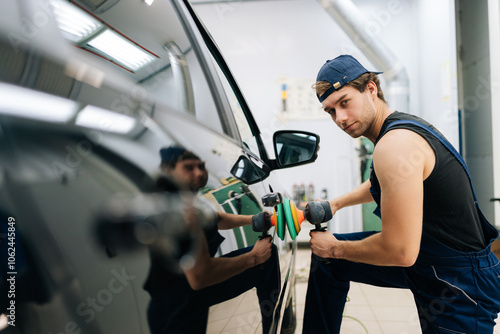 Portrait of confident mechanic male in uniform polish auto door using grinding unit in automobile repair and renew service station. Repair after accident. Concept of car repair and maintenance work.