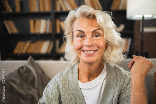Portrait of confident stylish European middle aged senior woman. Older mature 60s lady smiling at home. Happy attractive senior female looking camera close up face headshot portrait. Happy people