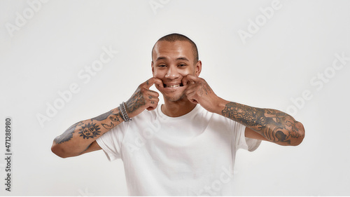 Portrait of cool mixed race tattooed guy looking at camera, forcing smile with fingers in his mouth while posing isolated over white background