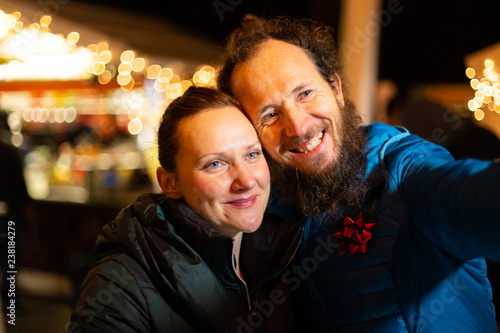 Portrait of couple taking selfie, traditional Christmas market, Zagreb, Croatia.