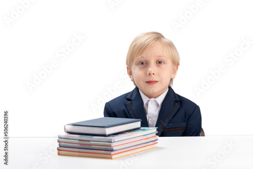 Portrait of cute blond boy in school uniform at table next to notebooks and textbook. Schoolboy and stationery.