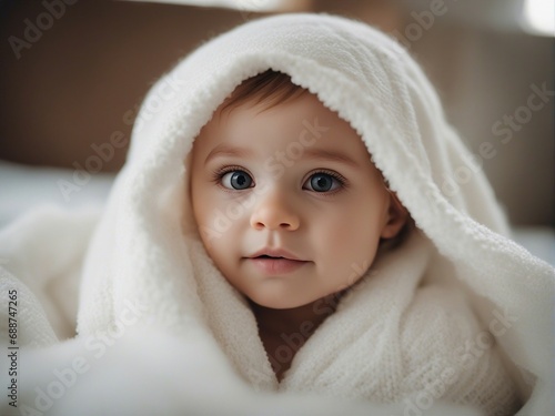 portrait of cute little american baby girl kid wrapped in soft white blanket on a bed