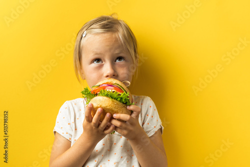 Portrait of cute little caucasian girl with blonde hair enjoying burger on a yellow background. Happy kid eating fast food burger