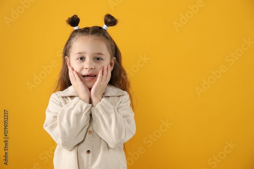 Portrait of cute little girl with missing tooth on orange background, space for text