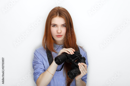 Portrait of cute redhead girl wearing blue striped shirt smiling with happiness and joy while posing with binoculars against white studio background