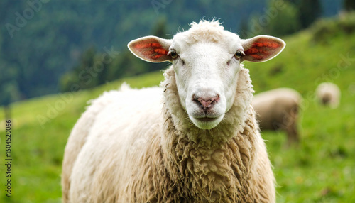 Portrait of cute white sheep. Domestic animal. Blurred green pasture.