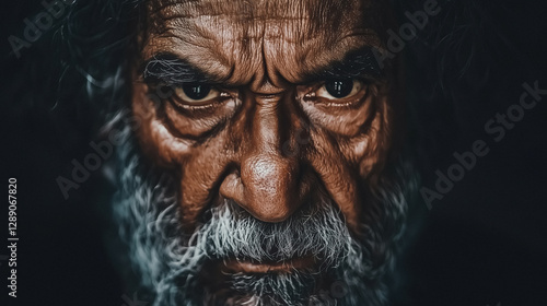 Portrait of elderly person with serious expression and weathered face set against dark background