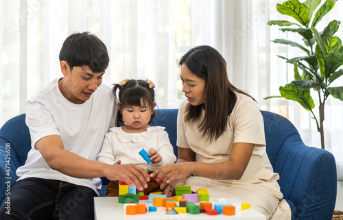 Portrait of enjoy happy love asian family father and mother with little asian girl smiling activity learn and skill brain play toy build wooden block board education game, children development at home